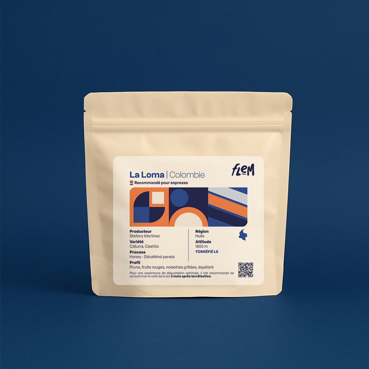 Produit par Stefany Martinez dans la région de Huila (1800 m), il est élaboré via un process honey avec décaféination à la panela (canne à sucre), une méthode douce et respectueuse du grain qui permet de préserver ses arômes.